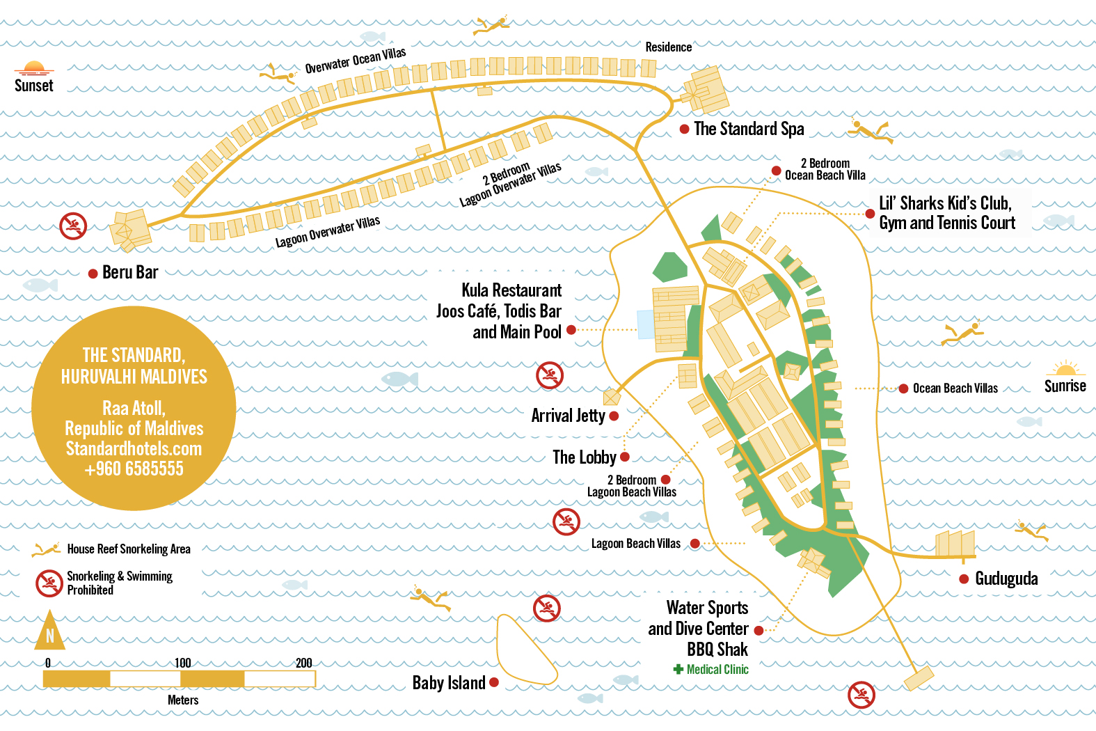 - The Standard Spa – Situata sull’acqua all’inizio del pontile delle ville, propone trattamenti esclusivi come rituali Hammam, massaggi, terapie per il corpo e il viso, yoga, fitness e terapia del suono. Dispone di bagno turco, docce emozionali e uno studio yoga.