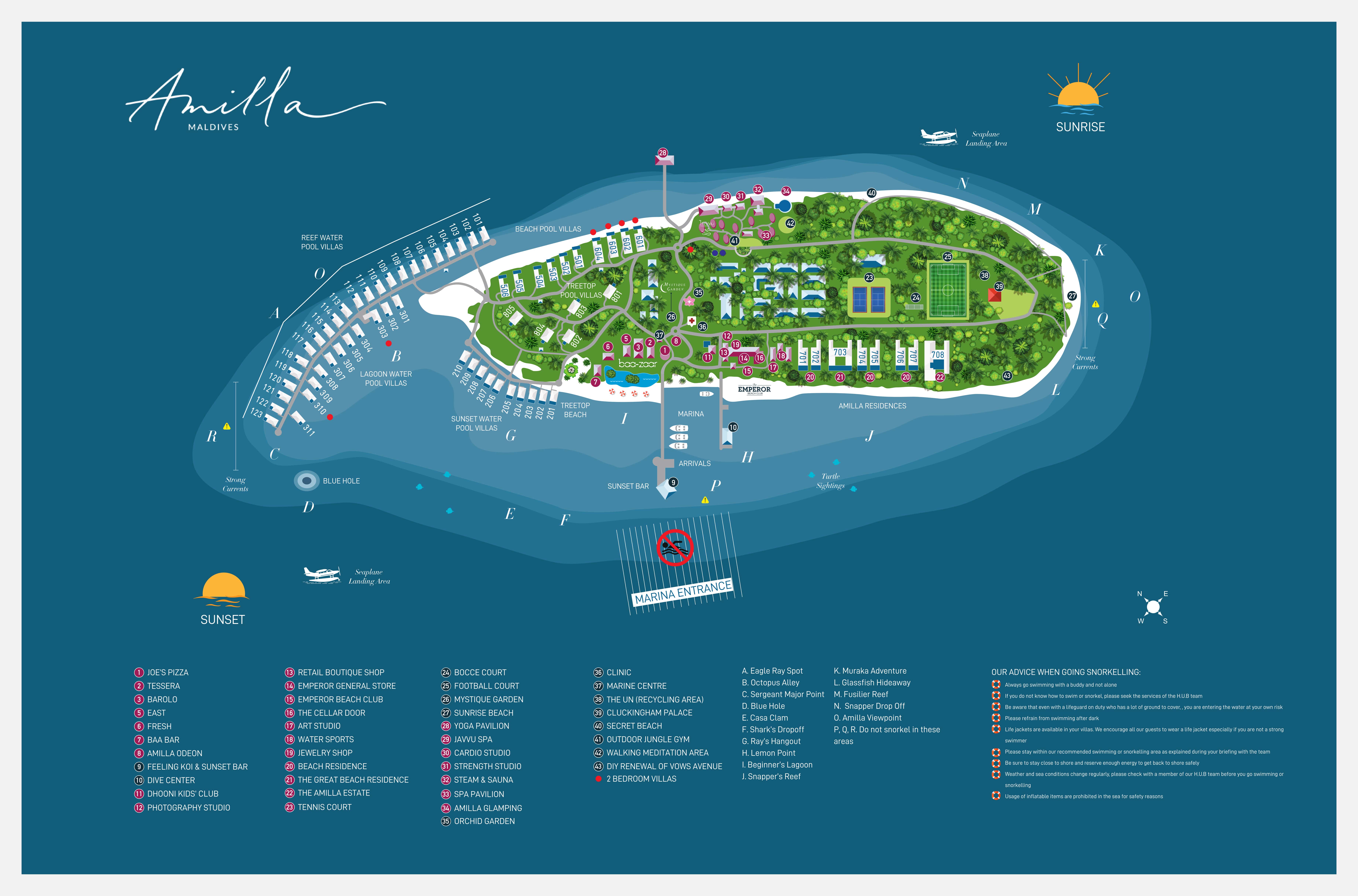 Amilla Maldives Resort & Residences è un resort 5* lusso, membro della Small Luxury Hotel of the World, che mette al centro di tutto la sostenibilità ed il benessere. L’isola (900X290 metri), situata nel Baa Atoll, riserva della biosfera UNESCO, è circondata da un house reef meraviglioso con il suo “blue hole” ed è a soli 10 minuti da Hanifaru Bay, che ospita il più grande raggruppamento di mante e squali balena del mondo (da maggio a novembre).